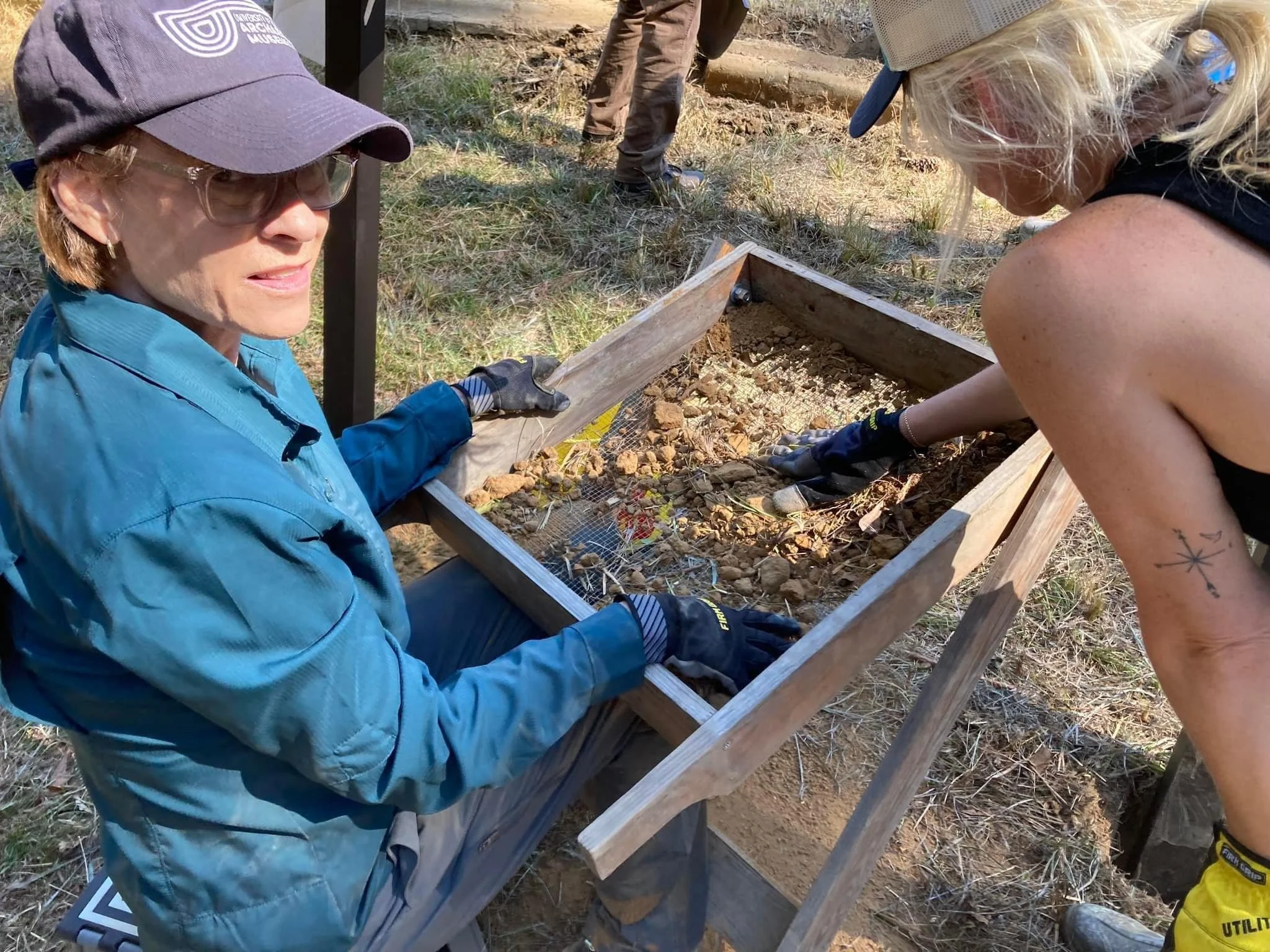 Volunteers screening soil for artifacts during preservation work at Twenty-Seven Mile Bluff. Archaeological discoveries at the site have included ceramics, trade beads, and other objects connected to the early French colony.