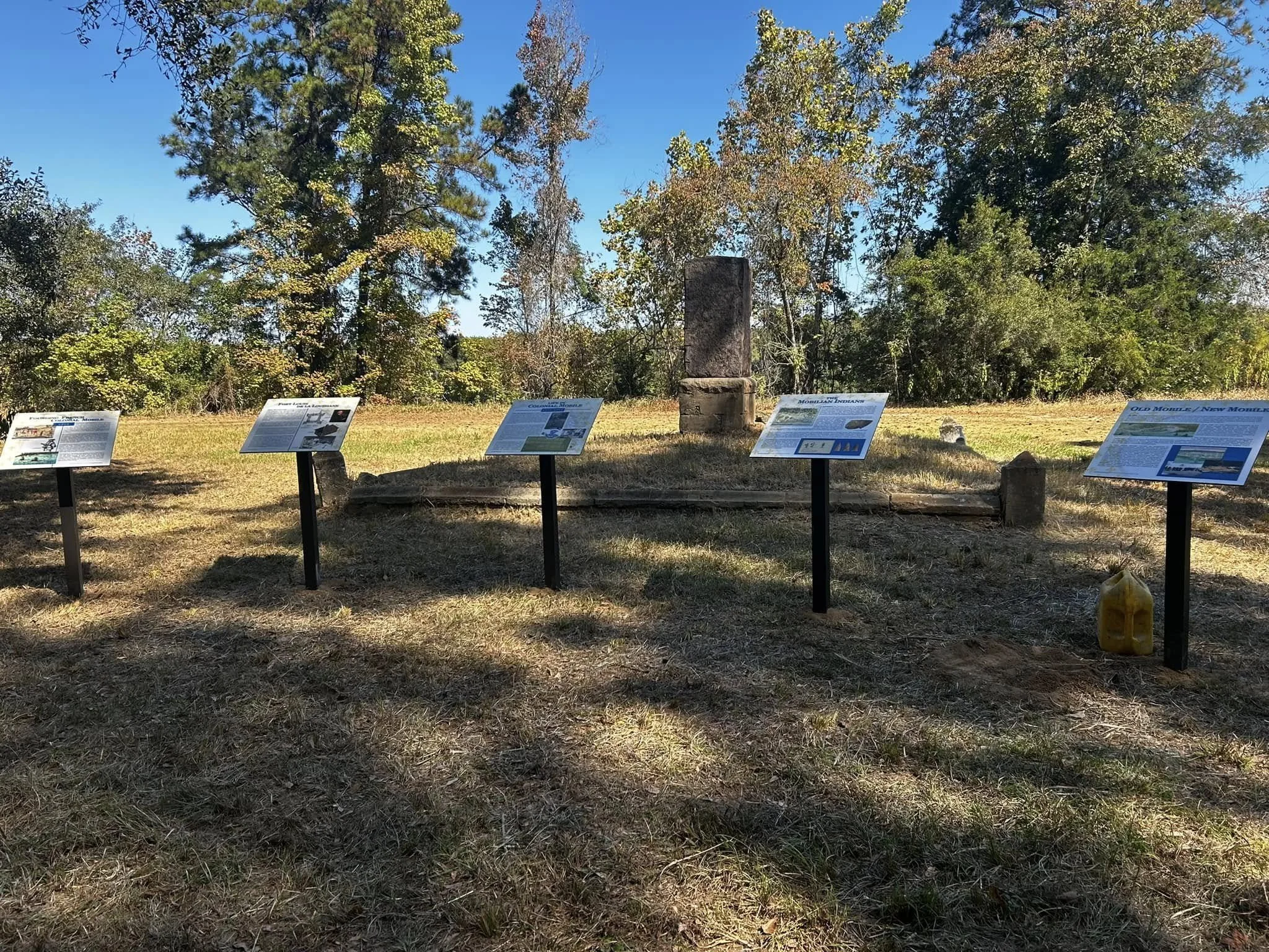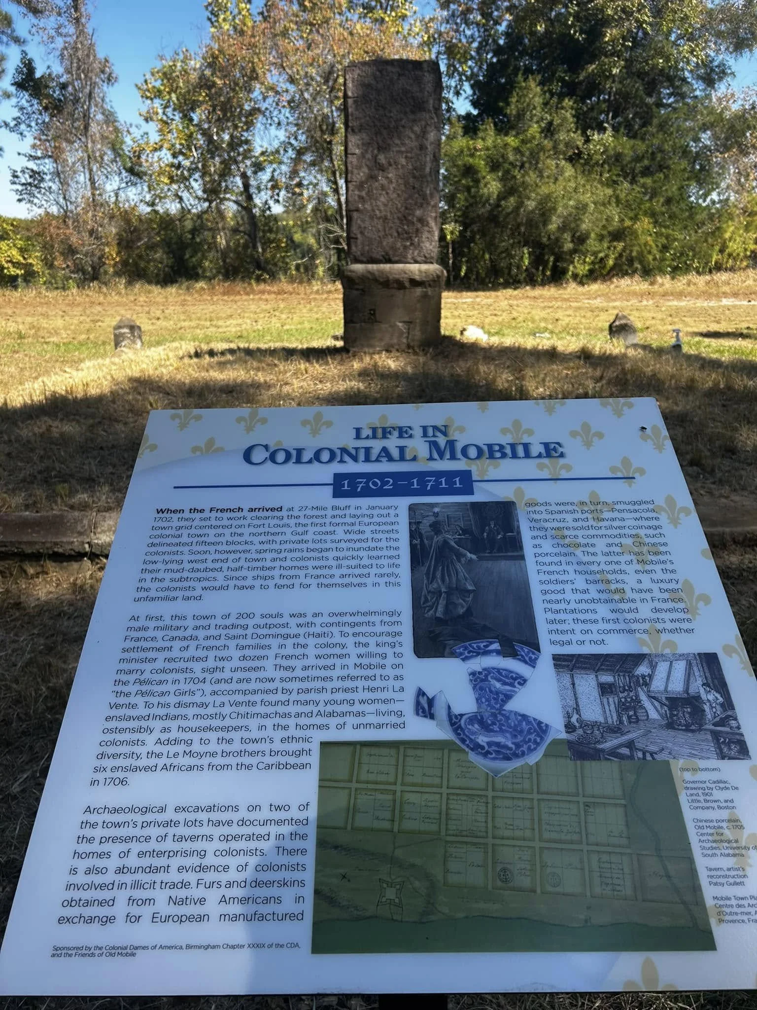 Today visitors to the Old Mobile site at Twenty-Seven Mile Bluff can learn about the early French settlement through a series of interpretive panels placed near the monument. These displays explain daily life in the colony between 1702 and 1711 and help visitors visualize the small trading town that once stood along the Mobile River. The panels were sponsored by the Colonial Dames of America—Birmingham Chapter XXXIX—and the Friends of Old Mobile.