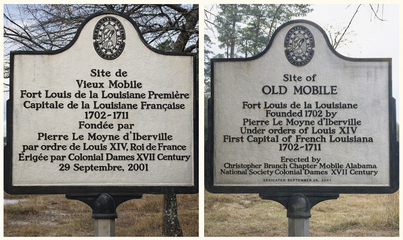 Historical marker identifying the site of Old Mobile (Fort Louis de la Mobile), the first capital of French Louisiana from 1702 to 1711. The marker was erected in 2001 by the National Society of the Colonial Dames of America XVII Century, Christopher Branch Chapter of Mobile.