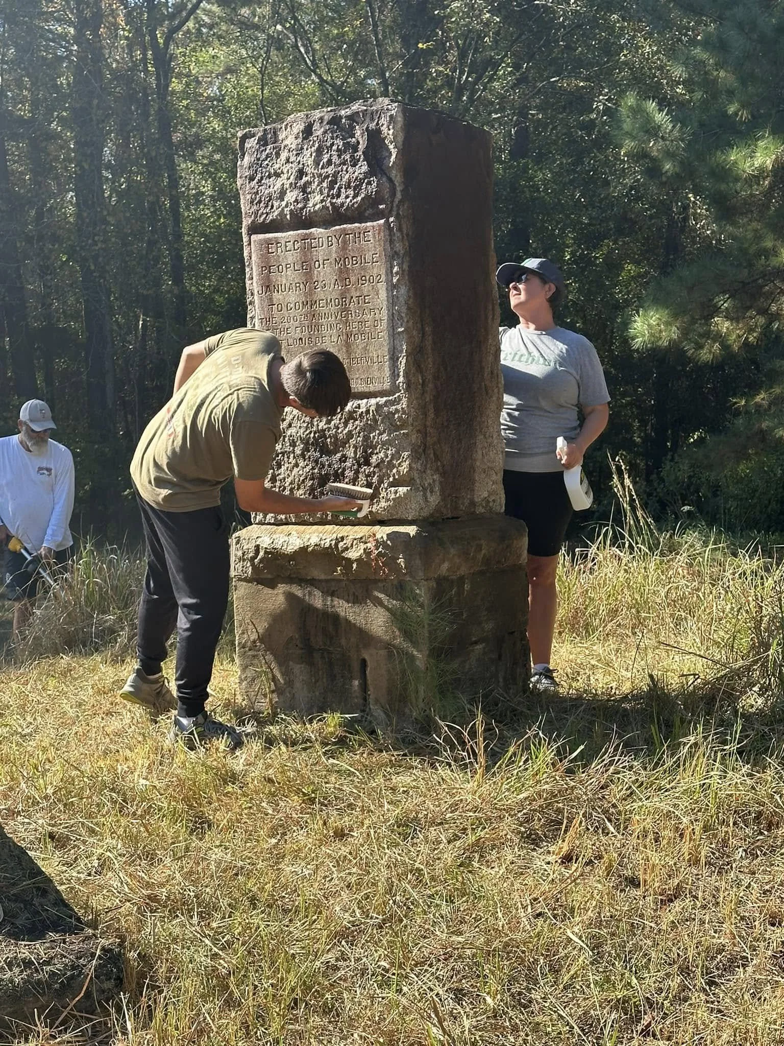 Volunteers clean the 1902 monument marking the site of Fort Louis de la Mobile during the October 2024 cleanup at Twenty-Seven Mile Bluff.
