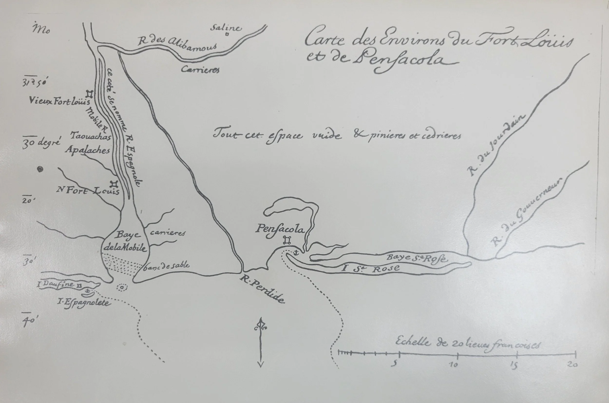 “Carte des Environs du Fort Louis et de Pensacola.” Early French map showing the region surrounding Fort Louis de la Mobile and Pensacola. Maps such as this helped French officials understand the strategic geography of the northern Gulf Coast during the early eighteenth century. The map also includes a note describing the surrounding terrain as “vast and covered with cedar thickets,” giving a glimpse of the landscape encountered by early French explorers.
